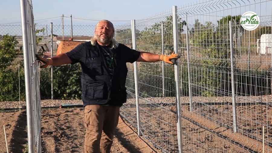 Os explicamos paso a paso en qué consiste y cómo hacer esta estructura. Lo primero es explicar que se trata de utilizar vallas de obra de unos 2 metros de altura aproximadamente, y 3 metros y medio de largo, fabricadas en hierro galvanizado, lo que permitirá que sea resistente y práctica, además de poder utilizarla año tras año. Es práctica porque al estar formada por malla metálica permite que la planta crezca por ella sin tenerla que atar prácticamente. Pondremos tantas vallas como queramos, podemos poner 1 o más. Nosotros vamos a hacer líneas de 3 vallas de longitud, poniendo varias líneas en paralelo, que uniremos en su parte superior posteriormente, lo que formará un conjunto muy resistente, y facilitará nuestro siguiente objetivo que será el sombreado.