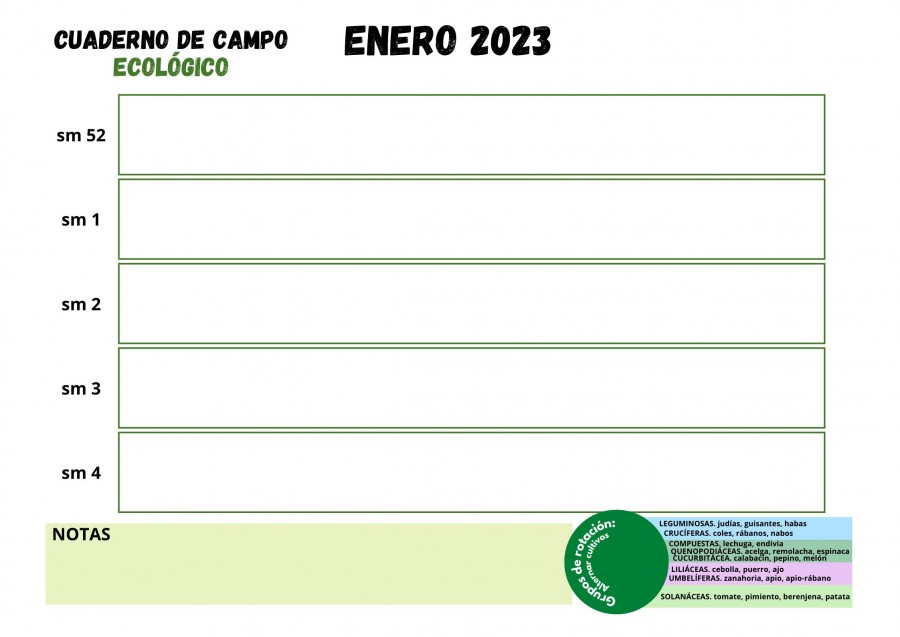 El cuaderno de campo recuerda continuamente los grupos de cultivo para planificar la rotación en el huerto. Verás el esquema que incluimos.