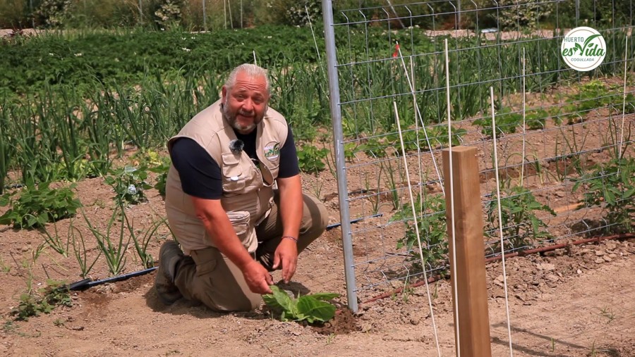Tenemos puestas varias líneas de tomate, y en los extremos de las líneas hemos plantado tabaco. Las usamos como trampa cromática o trampa para insectos. El tabaco atrae a los insectos, evitando que vayan a las plantas de tomate.