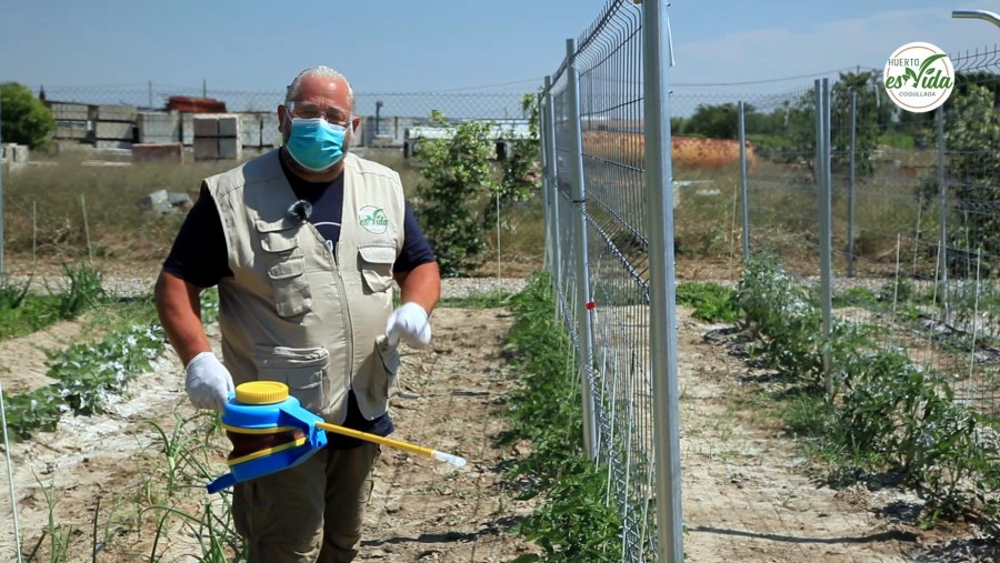 Sólo hay que aplicarlo sobre las plantas, sin miedo a que pueda caer más o menos cantidad, y sobre toda la línea. Con eso protegemos nuestras tomateras del sol y de las plagas.