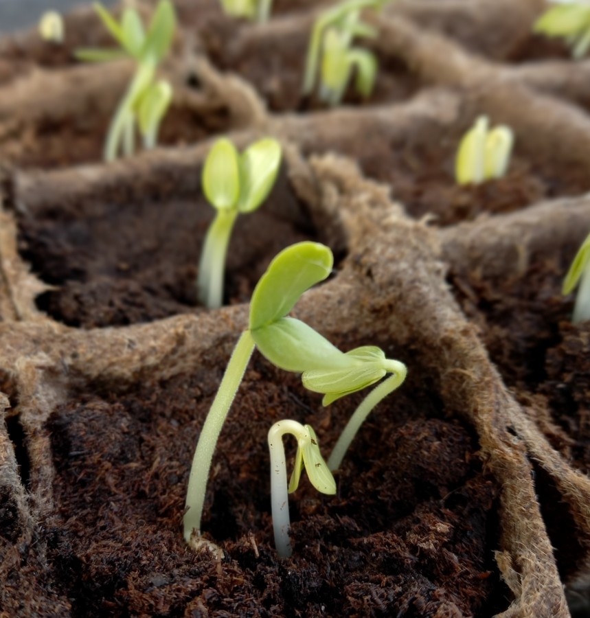 Para cambiarlas cada una de las que han nacido a su propia maceta, regamos un poco la maceta donde han nacido, y con mucho cuidado sacamos las plantas una a una, con su raíz. Las plantas tienen sus hojitas, que luego se pierden, se les llama “hoja falsa”. A la hora de cambiarlas de maceta, podemos optar por ponerlas en tierra, como es lo habitual, para lo que hacemos una agujero en la tierra de la maceta con un palito, introducimos la planta con su raíz, la cubrimos un poco y la regamos un poquito. Las macetas que utilizamos son de fibra de coco, que son completamente naturales y ecológicas, y además permiten trasplantar las plantas en el huerto con su propia maceta, que es biodegradable y permite que las raíces se desarrollen. Y hay una opción en lugar de la tierra, que es utilizar también fibra de coco. Se comercializa en pastillas compactadas, de forma que colocamos una de esas pastillas en la maceta y le echamos agua. En unos minutos, ha absorbido el agua y se ha formado como una bola de fibra que permite hacer un agujerito y poner nuestra planta dentro. Es un material muy bueno, ya que retiene mucho la humedad y las plantas se desarrollan muy bien en él. Estas macetas, las ponemos a su vez en recipientes de plástico, para que el agua que sale de la maceta, se retenga y mantenga la humedad y no se pierda.